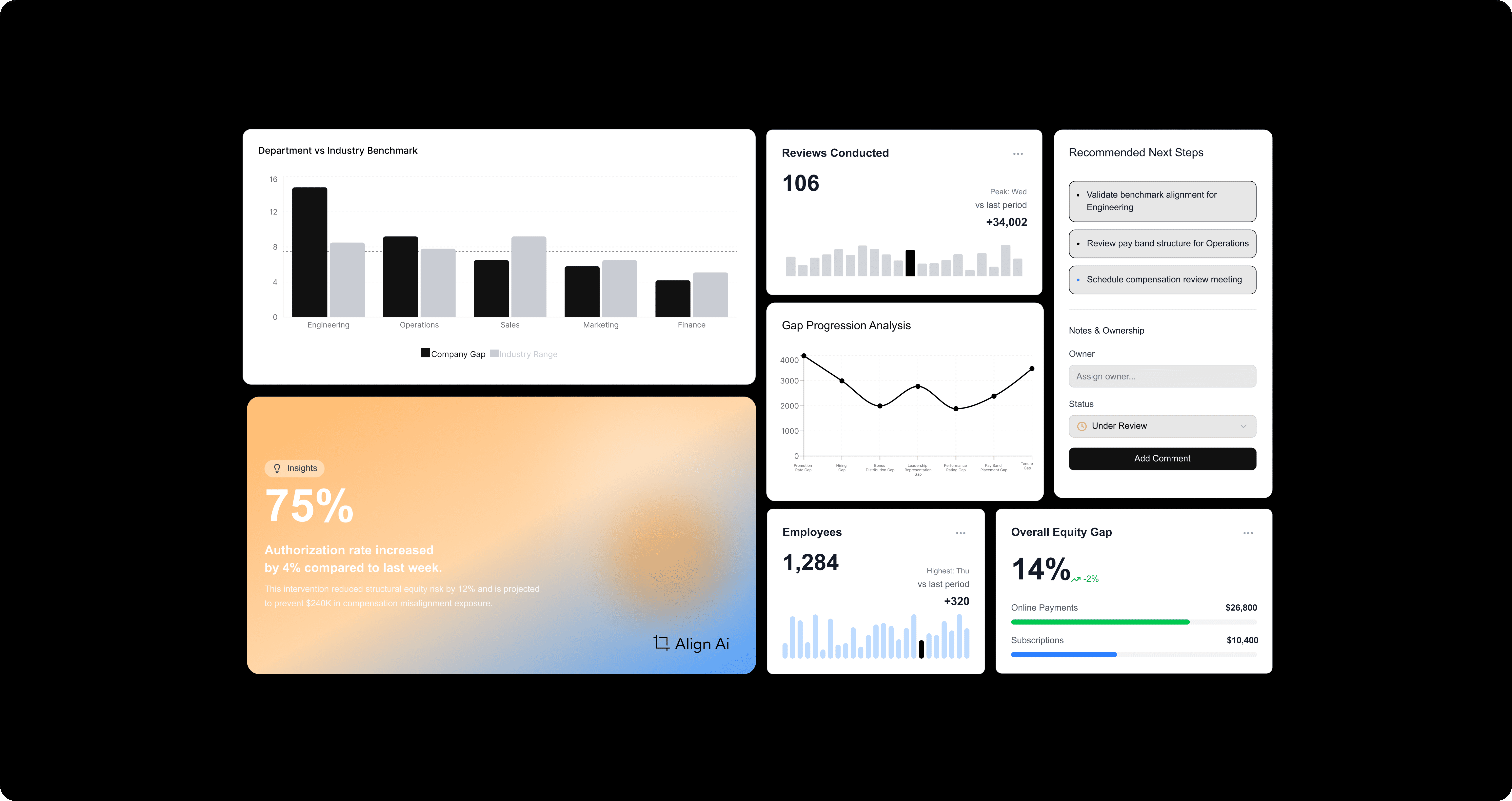 AlignAI is an organizational intelligence platform built to bring clarity and structure to workforce equity. Its visual identity reflects precision, neutrality, and trust through disciplined typography, strong contrast, and a system driven design language.