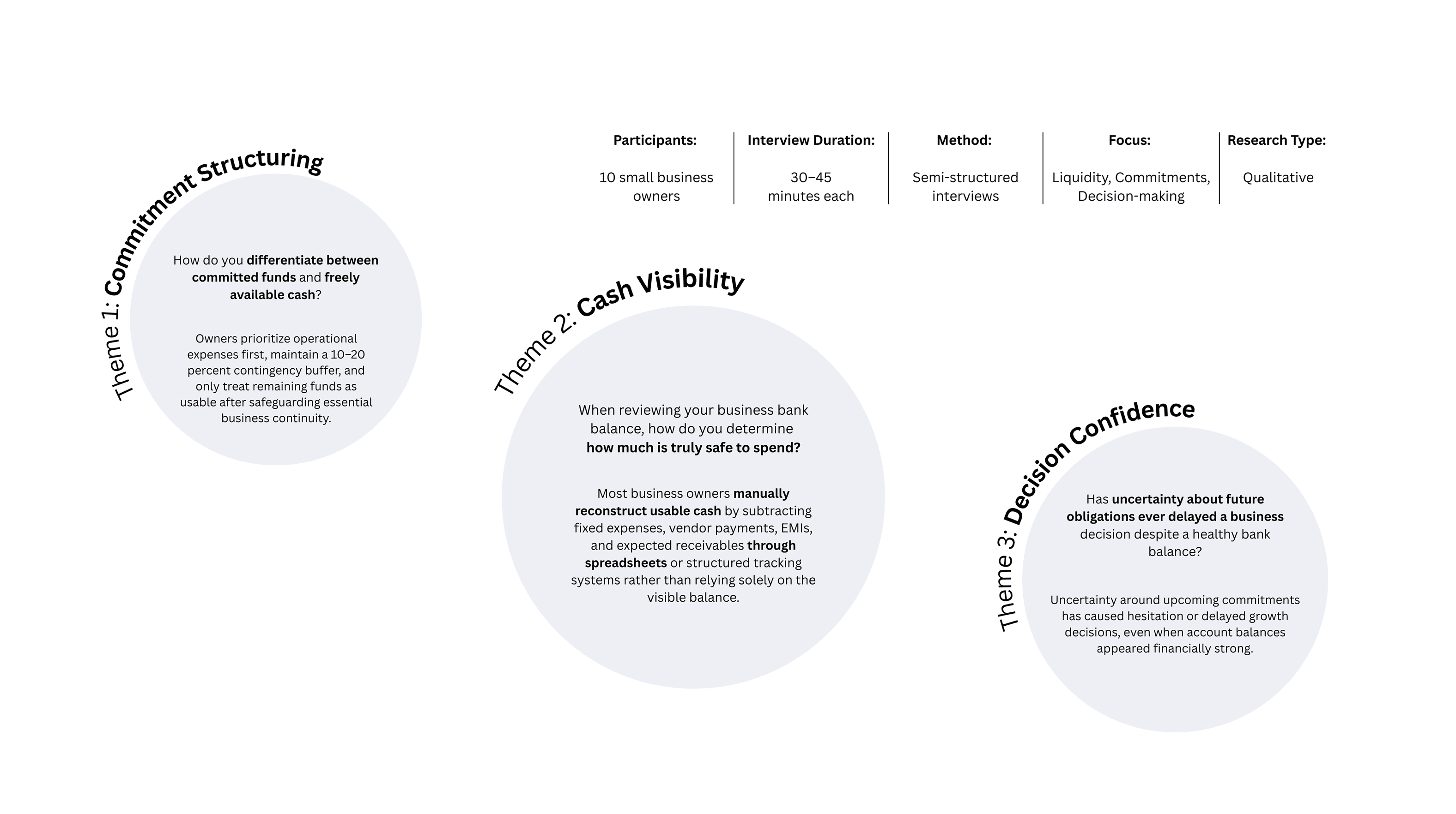 Through user interviews, I identified key decision thresholds where business owners pause or hesitate before spending, even when their bank balance appears healthy. These moments revealed that uncertainty around committed expenses and future obligations, not lack of funds, is what weakens financial confidence.