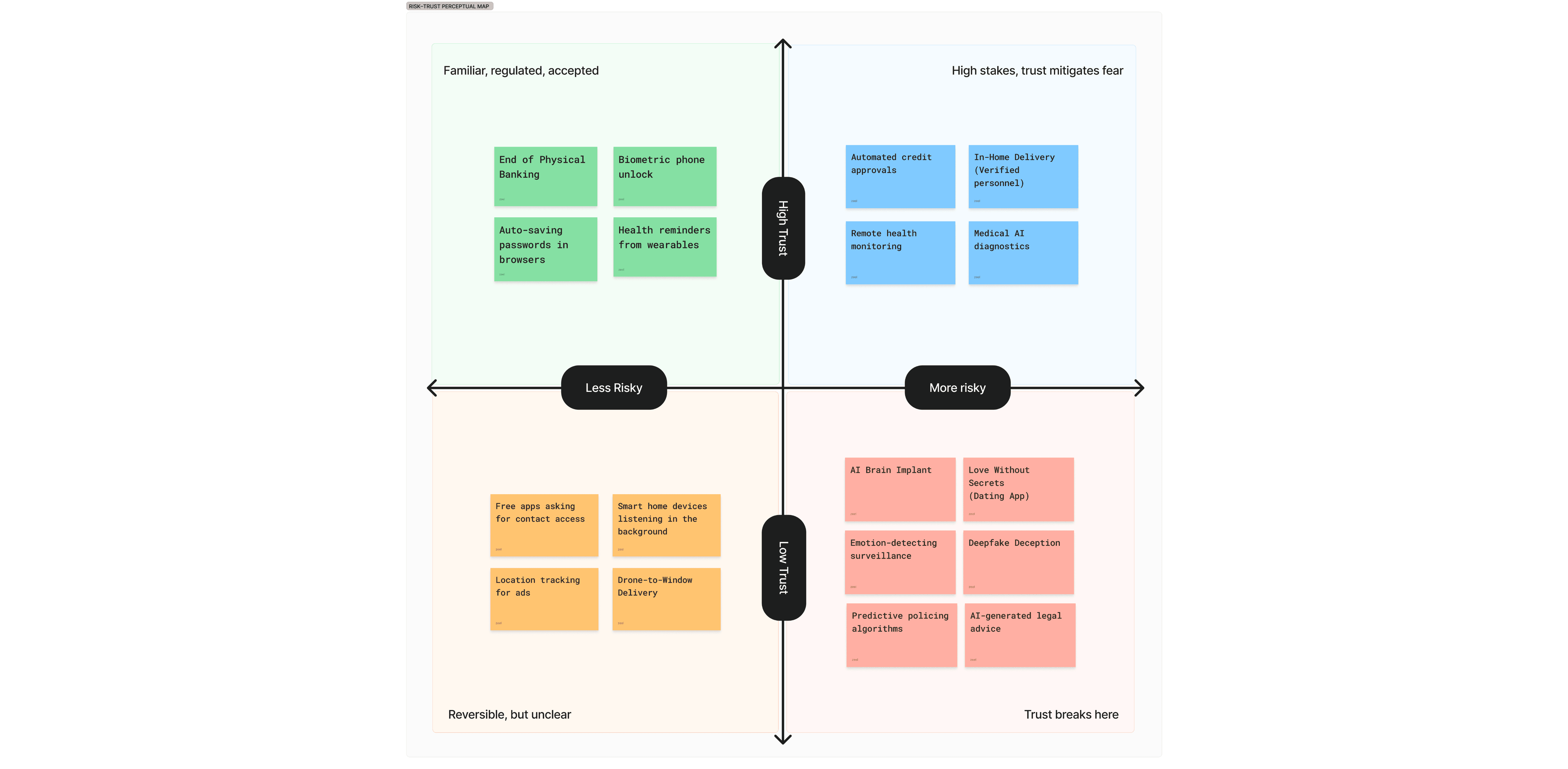 We structured the perceptual map to surface how trust shifts as perceived risk increases, clustering technologies by reversibility, governance clarity, and personal impact. Rather than ranking right or wrong choices, the map highlights where uncertainty concentrates guiding where users need context, comparison, and safeguards before adoption.