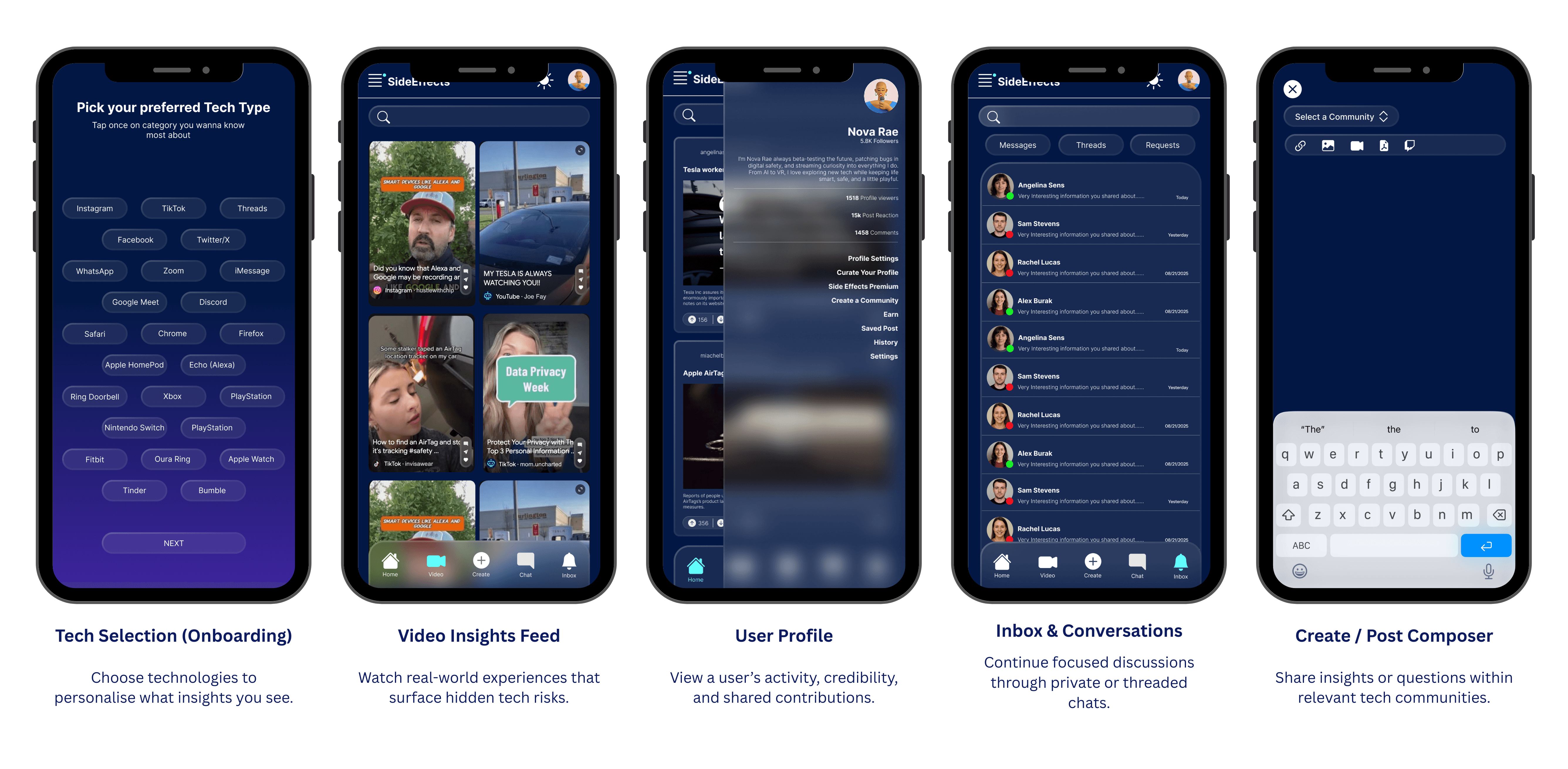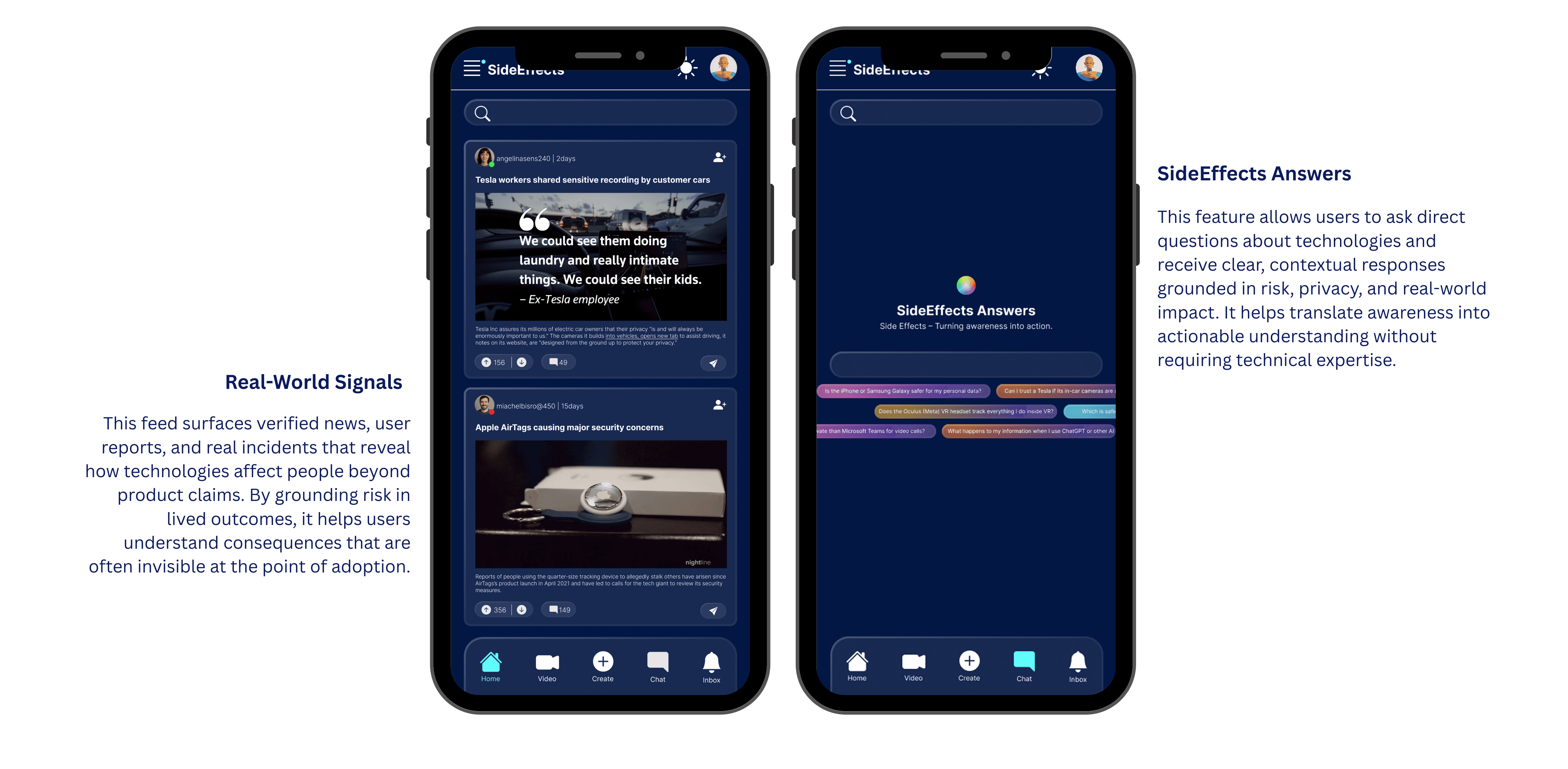 Side Effects became a dynamic platform where users can discover the truth of tech—both benefits and side effects. Through real-time news, product dashboards, verified expert and user voices, and interactive community spaces, the platform transforms scattered information into an accessible, social, and trustworthy feed.