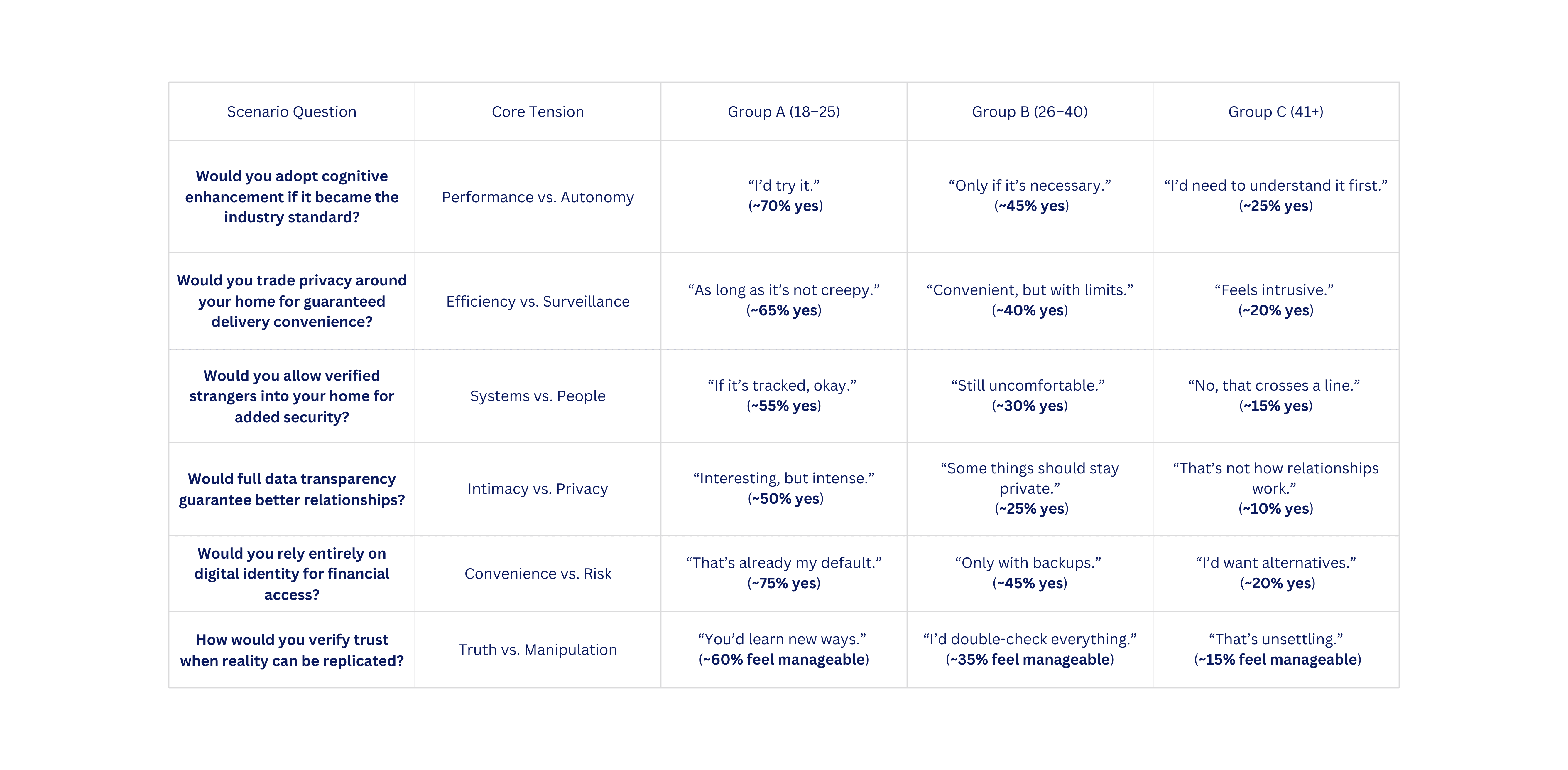 To ground the project in real behavior, we conducted focused group sessions using speculative scenario cards that exaggerated familiar technologies and future possibilities. These discussions surfaced moments of hesitation, discomfort, and acceptance, revealing how people often adopt products without fully understanding their consequences shaping how we framed transparency, risk, and decision-making in the platform.